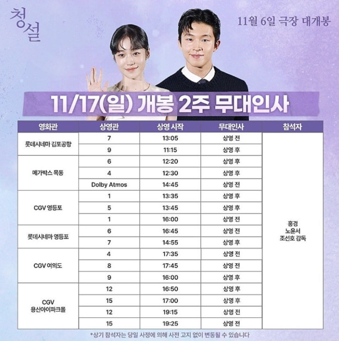 영화 <청설>의 개봉을 기념하여 주연 배우 홍경, 노윤서, 김민주가 직접 무대인사를 통해 팬들과 소통하는 자리를 마련했습니다. 다음은 주요 무대인사 일정입니다.