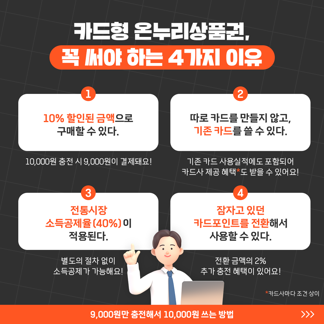 경제적 혜택을 중요하게 여기는 소비자에게도 온누리상품권은 매력적인 선택입니다. 10% 할인된 금액으로 충전이 가능해 구매 시점부터 이득을 볼 수 있으며, 필요에 따라 카드포인트를 온누리상품권으로 전환해 사용할 수 있어 경제적인 소비를 선호하는 분들에게 추천됩니다. 특히, 온누리상품권을 이용하면 평소 카드사에서 제공하는 추가 혜택을 누릴 수 있어 더 많은 혜택을 받을 수 있습니다.