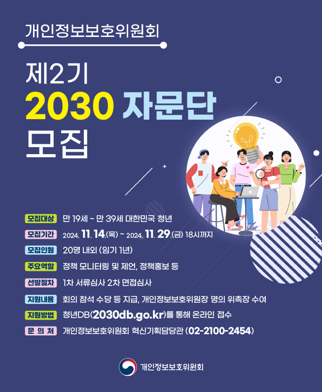 개인정보보호위원회가 주관하는 제2기 2030 자문단 모집이 시작되었습니다. 이 자문단은 청년들의 관점에서 개인정보보호 정책 전반에 대한 의견을 반영하고, 정책 모니터링 및 제안을 통해 청년 세대의 목소리를 담는 중요한 역할을 합니다. 본 포스팅에서는 모집 정보, 지원 방법, 활동 내용 및 혜택에 대해 상세히 알아보겠습니다.