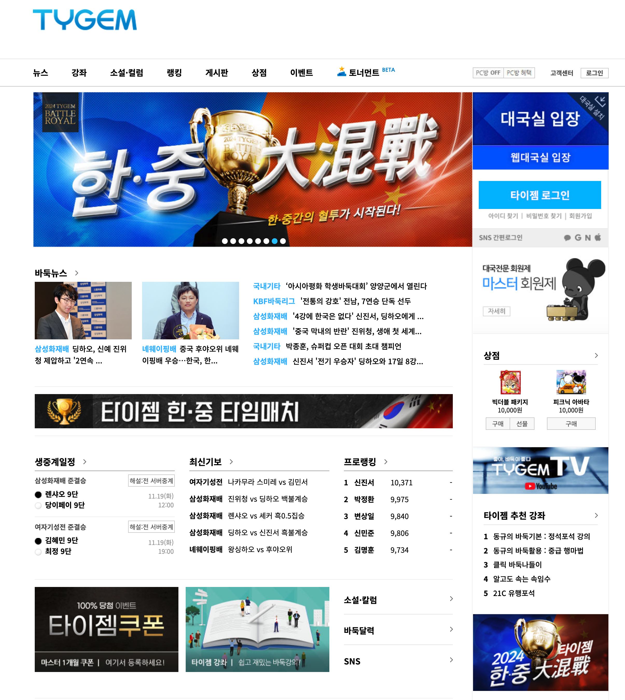 웹 브라우저에서 타이젬 공식 웹사이트에 접속합니다. 홈페이지의 상단 메뉴에서 '대국실'을 클릭하여 설치 페이지로 이동합니다.