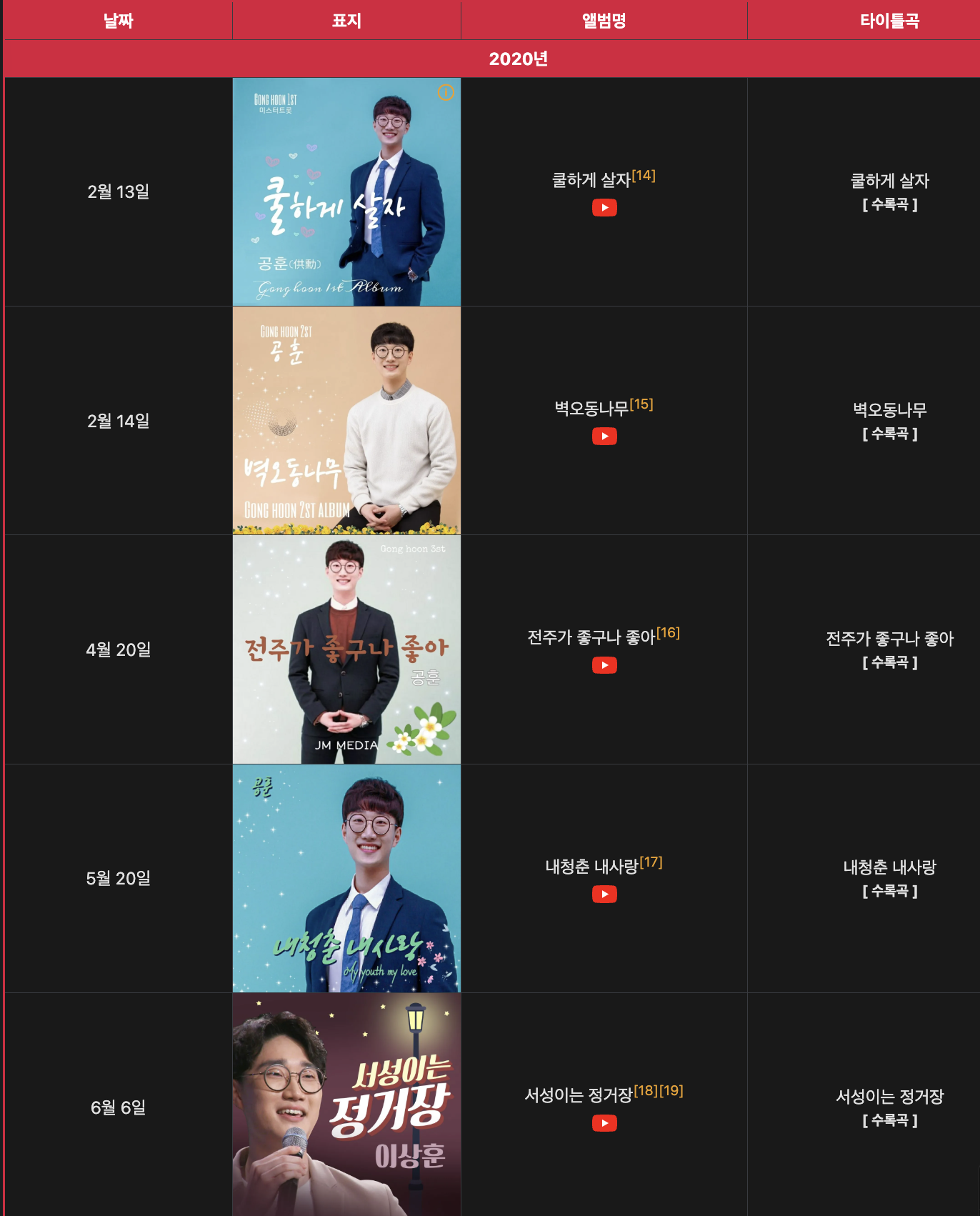 공훈은 데뷔 후 다양한 음반을 발표하며 자신의 음악 세계를 구축했습니다. 그의 대표곡은 다음과 같습니다: