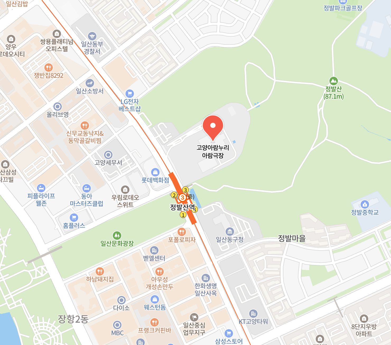 2. 정발산역 3번 출구로 나와 도보로 약 5분 정도 이동하면 고양아람누리 아람극장이 보입니다.