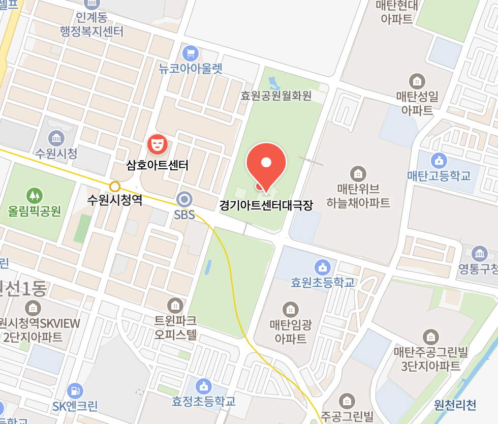 - 수원시청 방면에서 오시는 경우, 수원시청역을 기준으로 효원로를 따라 이동하면 경기아트센터에 도착할 수 있습니다.