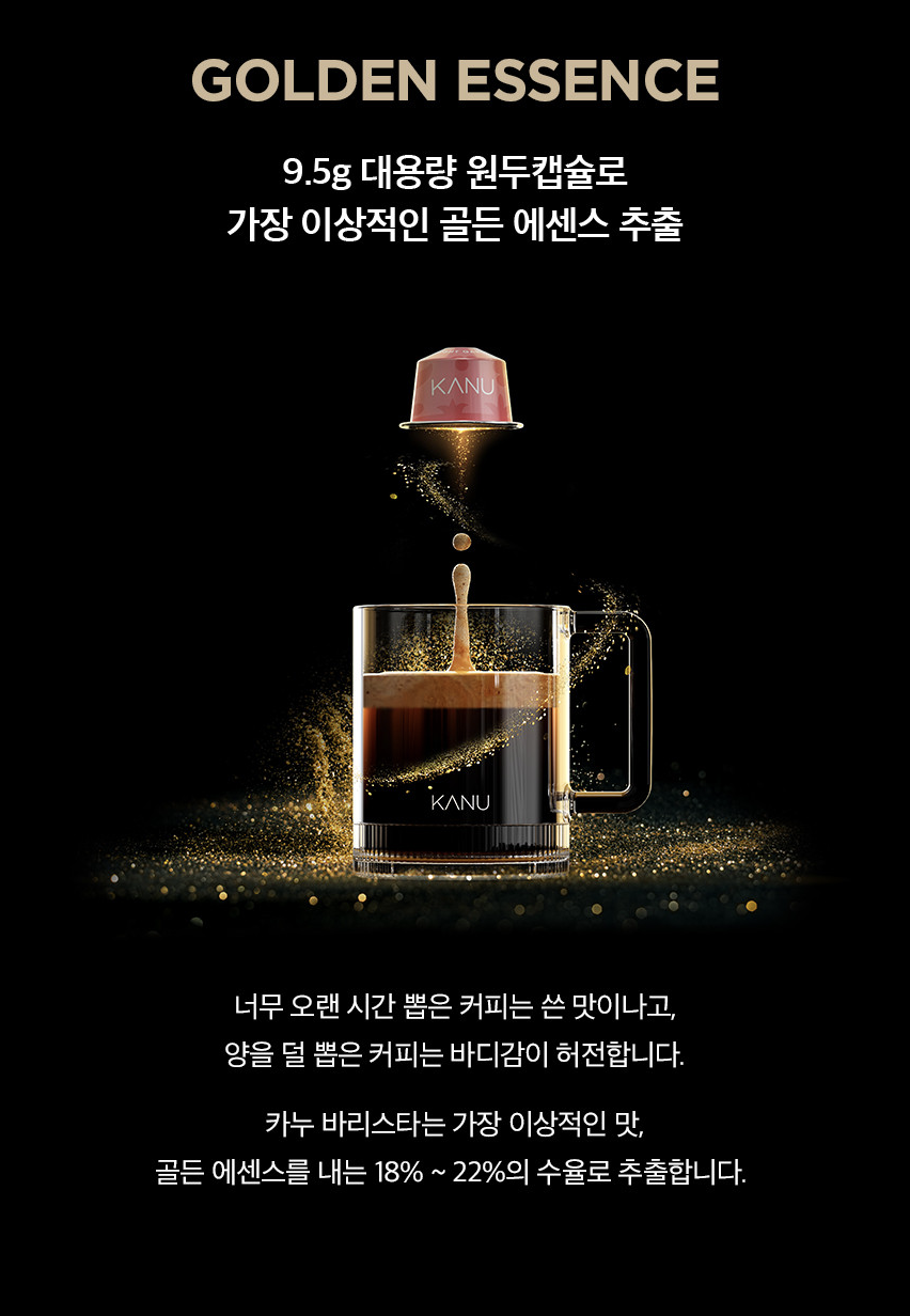 이 캡슐커피머신은 에스프레소와 아메리카노를 기본으로, 카누 바리스타 캡슐을 이용해 다양한 맛을 즐길 수 있도록 설계되었습니다. 또한, 필요에 따라 물 양을 조절하여 원하는 강도와 맛의 커피를 쉽게 조정할 수 있습니다. 시간과 노력을 절약하면서도 카페 수준의 커피를 집에서 간편하게 즐길 수 있는 점이 큰 매력입니다.