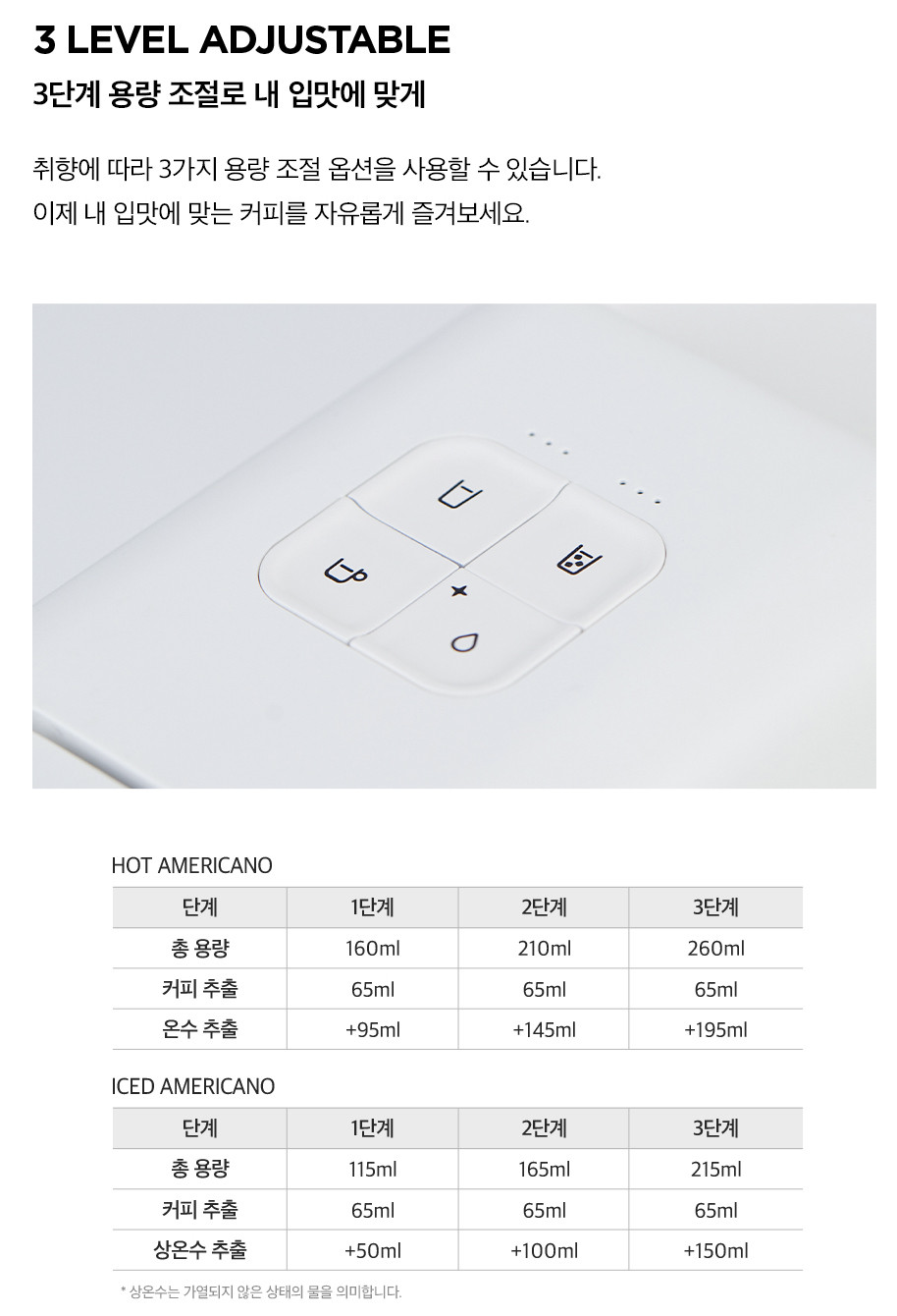이 캡슐커피머신은 에스프레소와 아메리카노를 기본으로, 카누 바리스타 캡슐을 이용해 다양한 맛을 즐길 수 있도록 설계되었습니다. 또한, 필요에 따라 물 양을 조절하여 원하는 강도와 맛의 커피를 쉽게 조정할 수 있습니다. 시간과 노력을 절약하면서도 카페 수준의 커피를 집에서 간편하게 즐길 수 있는 점이 큰 매력입니다.
