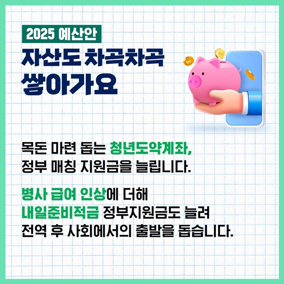 청년들의 목돈 마련을 돕기 위해 청년도약계좌의 정부 매칭 지원금을 증액합니다. 또한, 병사들의 급여를 인상하고, 내일준비적금의 정부 지원금을 늘려 전역 후 사회 진출 시 경제적 기반을 마련할 수 있도록 지원합니다.