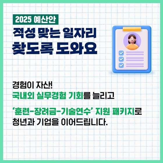 청년들이 다양한 분야에서 실무 경험을 쌓을 수 있도록 국내외 인턴십 및 실습 기회를 확대합니다. 이를 통해 청년들이 적성에 맞는 일자리를 찾을 수 있도록 지원하며, '훈련-장려금-기술연수'로 이어지는 패키지 프로그램을 통해 기업과 청년 간의 연결을 강화합니다.