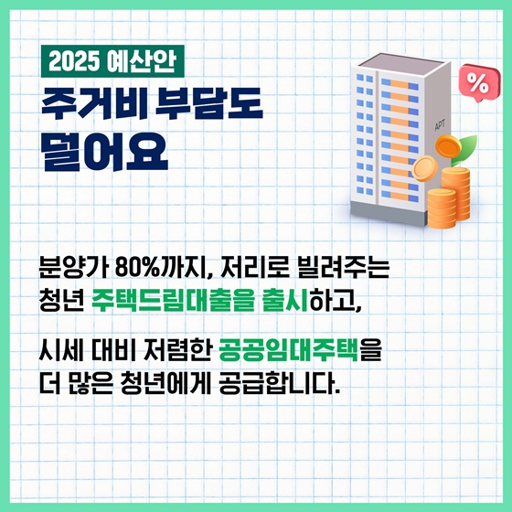청년들의 주거비 부담을 줄이기 위해 분양가의 80%까지 저리로 대출해주는 청년 주택드림대출을 출시합니다. 또한, 시세 대비 저렴한 공공임대주택을 더 많은 청년들에게 공급하여 안정적인 주거 환경을 제공합니다.