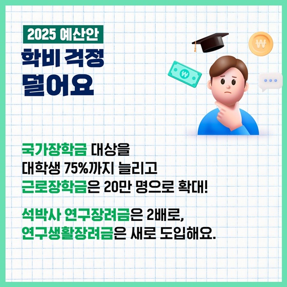 정부는 대학생들의 학비 부담을 줄이기 위해 국가장학금 지원 대상을 대학생의 75%까지 확대할 계획입니다. 또한, 근로장학금 수혜 인원을 20만 명으로 늘려 학생들이 학업과 병행하여 경제적 지원을 받을 수 있도록 지원합니다. 석·박사 과정의 연구장려금은 기존 대비 2배로 증액되며, 새로운 연구생활장려금 제도를 도입하여 연구에 전념할 수 있는 환경을 조성합니다.